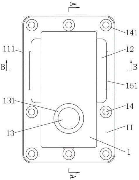 進(jìn)一步的,密封構(gòu)造包括密封護(hù)邊111,密封護(hù)邊111沿底板11的外側(cè)設(shè)置,且與底板11形成凹陷槽,密封護(hù)邊111的凹陷槽與底座相匹配,安裝時(shí)用于將底座包饒?jiān)趦?nèi)部。箱體1通過(guò)密封護(hù)邊111包饒?jiān)诘鬃希軌驅(qū)⒌装?1與底座之間的縫隙包住,防止外界空氣中的灰塵進(jìn)入到底板11與底座之間的縫隙中。